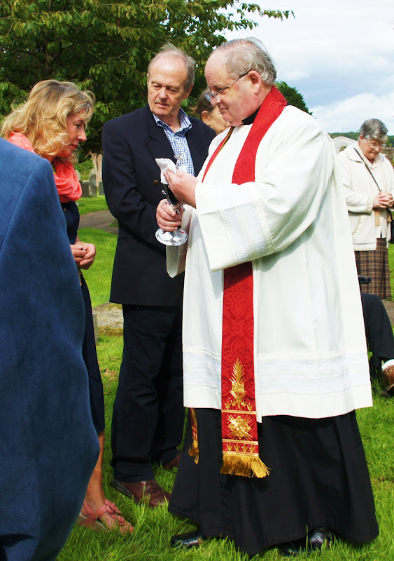 The botched execution caused more pain to Father Lewis, but finally two Protestants he had helped made sure he had died at the hanging, dragging at his hands, s there was no drawing and quartering,and the body was laid in the graveyard in the parish church, where it was later found during excavation and buried in a more prominent place at the Church door of the former priory, now Anglican Church.At he graveside, the relic was brought to each member of the congregation for veneration, as the Faithful sang 'Faith of Our Fathers'.Flowers had been placed on the grave and a photograph of a portrait of the saint, I think painted while he was in France as a youngish man. Father Adrian then knelt to venerate the gravestone, which all the other pilgrims also did. No 'Salve Regina' this time, sadly. In attendance were also the sisters of St Joseph of Annecy at Llantarnam, and some monks from Belmont. Father Adrian goes to Ledbury and Ross from Cwmbran, but I do hope that he keeps his association with the pilgrimage. After refreshments at the Parish Hall for some and The Three Salmons for others, people took their cars and coaches home, happy the saint had been venerated, thanked and remembered for another year, and he will continue to intercede for all those in the persecuted Church.
