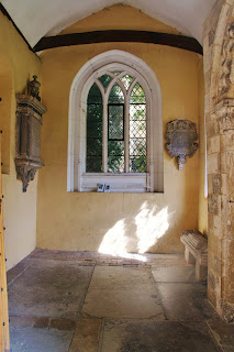 from the facade on the picture, and had to be demolished in 1861. Outside the chapel there are carvings on the wall, considered to be linked with St Mary Magdalene, a very popular saint and patron of lepers, and there may have been pilgrimages here in the Middle Ages. The date of the chapel could be perhaps dated to the carving of the Aragon Pineapple on one of the columns.There are crosses and floral motifs. In our sceptical age there are those who do not believe the small effigy held in the chapel is that of St Kyneburgha and, even though it was in her chapel, tend to believe it was one of the young daughters of Humphrey de Bohun, a patron of Llanthony Secunda. A new oak door was fitted at the entrance of the chapel, now only a chancel.to replace that which had been vandalised.Repairs were carried out to the leaded windows at the same time.I was fortunate Gloucester History Week allowed me to get in to photograph the St Mary Magdalene Chapel and the effigy.